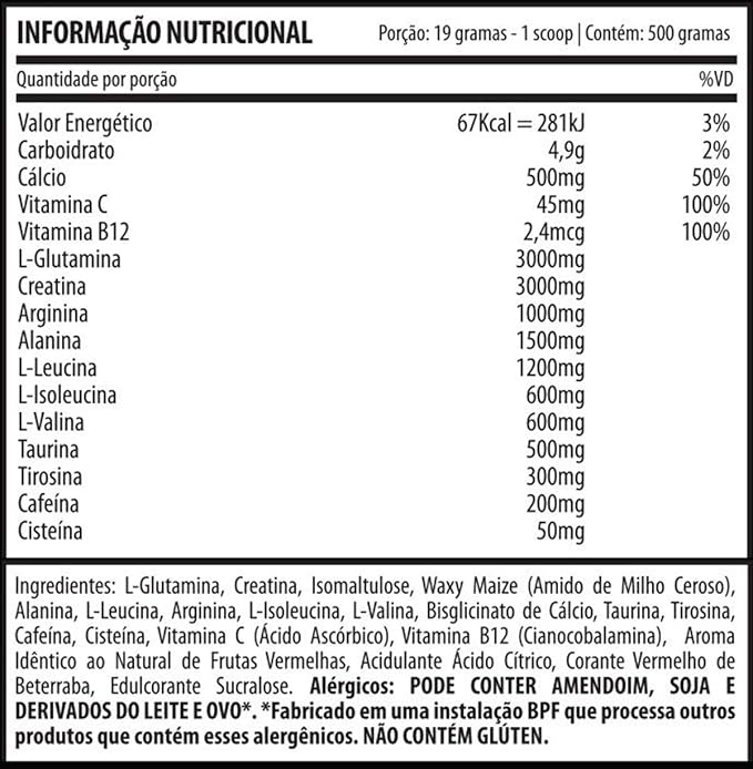 Fruit Punch: L-Glutamina, Creatina, Isomaltulose, Wazy Maize (Amido de Milho Ceroso), Alanina, L-Leucina, Arginina, L-Isoleucina, L-Valina, Bisglicinato de Cálcio, Taurina, Tirosina, Cafeína, Cisteína, Vitamina C (Ácido Ascórbico), Vitamina B12 (Cianocobalamina), Aroma Idêntico ao Natural de Frutas Vermelhas, Acidulante Ácido Cítrico, Corante Vermelho de Beterraba, Edulcorante Sucralose.