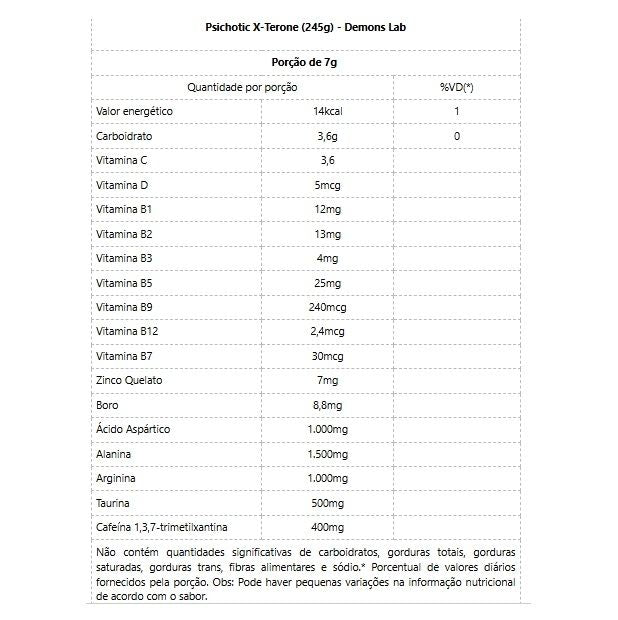 Conclusão: O Psichotic T-Xterone (245g) da Demons Lab é o suplemento pré-treino perfeito para quem deseja elevar seu desempenho e promover a produção natural de testosterona. Com uma formulação completa e ingredientes potentes, ele oferece energia, força, resistência e foco, além de acelerar a recuperação muscular e reduzir os efeitos do cortisol. Experimente o Psichotic T-Xterone e supere seus limites.